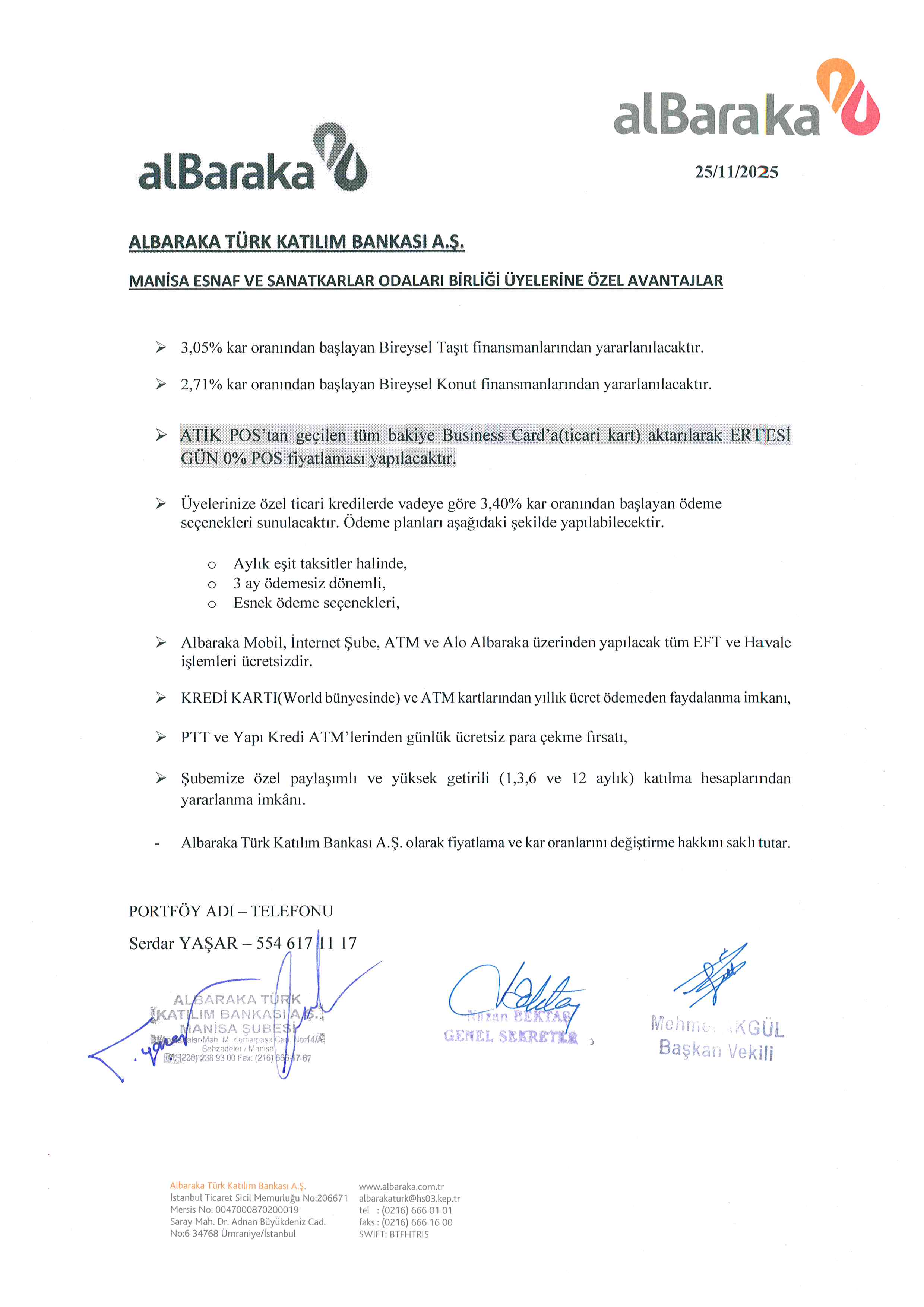 Albaraka Türk Katılım Bankası A.Ş. nin Manisa Esnaf ve Sanatkarlar Odaları Birliği Üyelerine Özel Avantajları